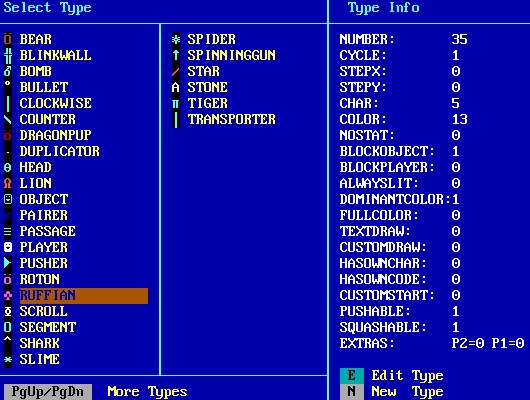 Of course, I realize everyone has long gotten used to the older "Items/Creatures/Terrains" configuration. You still have those menus if you want them. Pressing 'E' will toggle the editor interface, giving you KevEdit menus, ZZT menus, or Super ZZT menus.