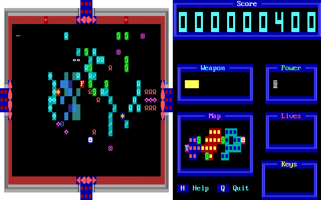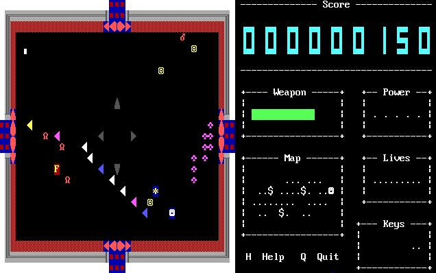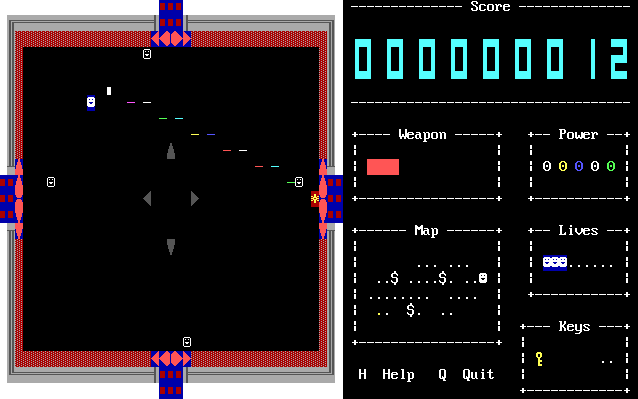 The controls, as you might imagine, are twin-stick simultaneous move-and-shoot. You can do this in ZZT Ultra by overriding the PLAYER type and altering how inputs are read.